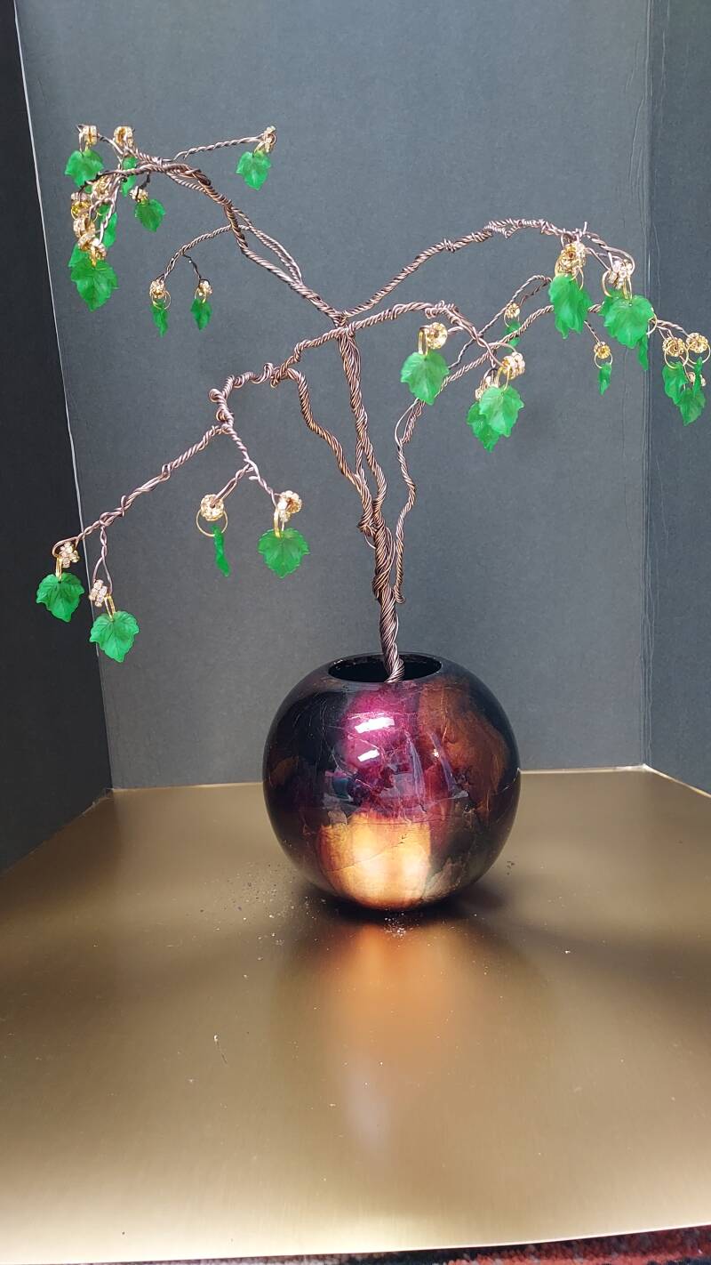 This is a large golden wire tree with green acrylic leaves, in a 10" reds and golden globe