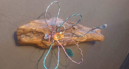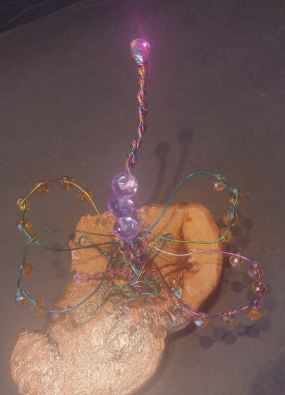 The is a large Tri-colored wire butterfly with rhinestones and melted glass attached it can be added to many different bases. Just let me know and I shall see what I can find.