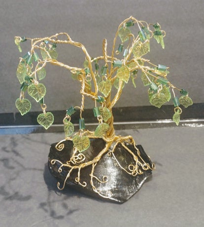 This is a Gold Wire Tree with Green transparent Leaves and green AB Crystals on a Raw Obsidian Rock