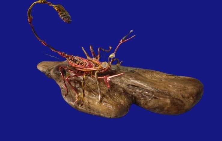 BUG EYES ON DRIFTWOOD made of wire, melted glass eyes, and drift wood.