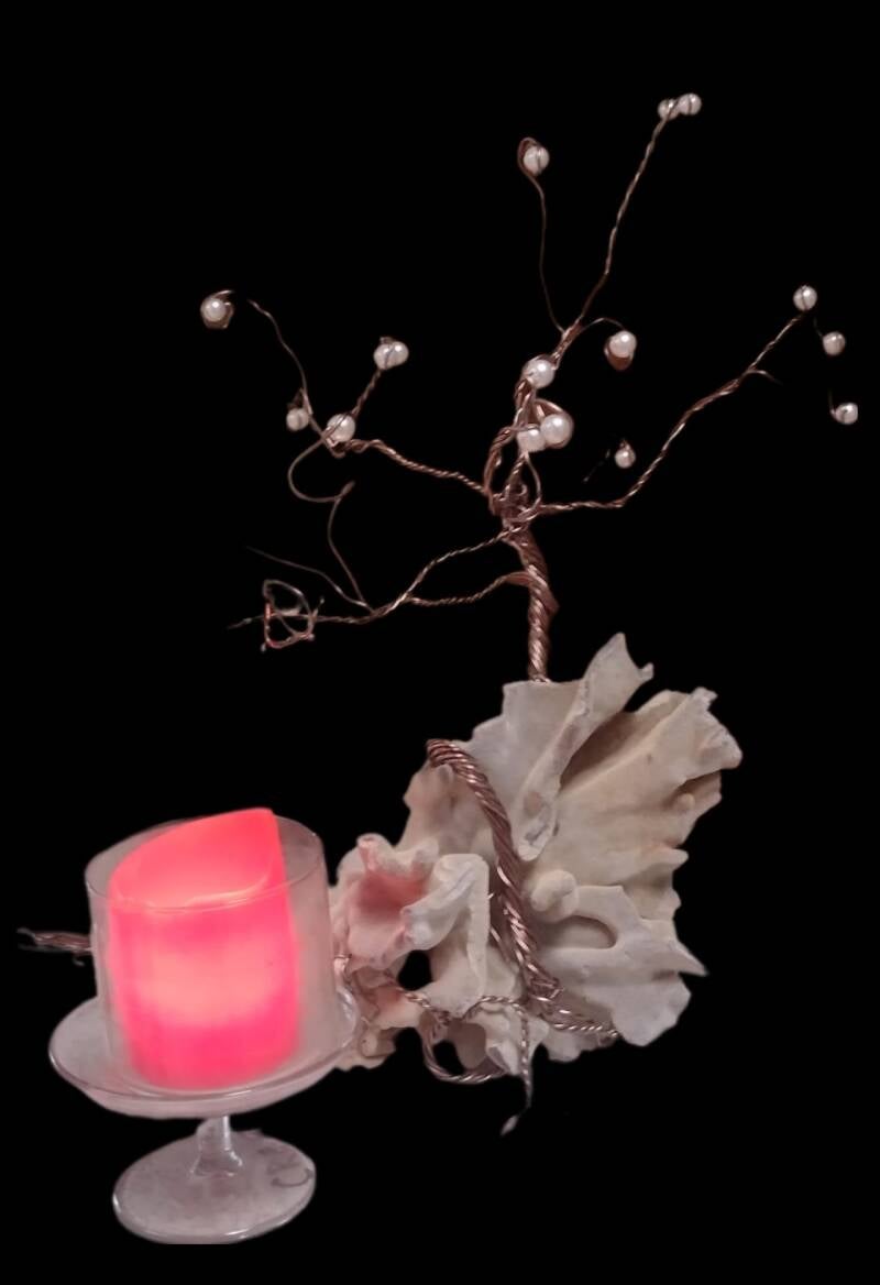 Gold Wire Tree sitting in a wooden bowl with green nightlight.